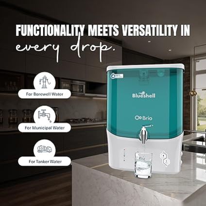 The Blueshell Brio Green RO Water Purifier delivers pure, healthy, and eco-friendly drinking water with its advanced Water Saving Technology. Designed for borewell, tanker, and municipal water, it offers efficient RO purification, a 9L storage tank, and a sleek green design — combining performance, sustainability, and style for your modern kitchen